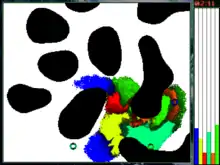 Gameplay takes place on a 2D battlefield, usually with some obstacles. Each player (2 to 6, computer or human) has an army of particles and a cursor. The objective of the game is to assimilate all enemy particles. The players can only move their cursors and cannot directly control the particles. Each particle follows the shortest path around the obstacles to its team's cursor. A player may have several thousands particles at a time, giving the collection of particles a look of a liquid blob. When a particle moves into a particle from a different team, it will fight and if the opponent particle fails to fight back (it is not moving in the opposite direction) it will eventually be assimilated by its attacker. As particles cannot die but only change teams, the total number of particles on the map remains constant. Since a particle can only fight in one direction at a time (towards its team's cursor), a player that surrounds its opponents will have a distinct advantage. The game ends when one player controls all of the particles or when the time runs out. When the time runs out, the player with the most particles wins.