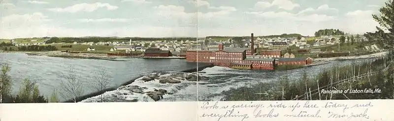 Abenaki Indians called the falls Anmecangin, meaning "much fish". The area was once part of Little River Plantation, a portion of which was incorporated in 1799 as Thompsonborough, then renamed in 1802 after Lisbon, Portugal. In 1806, Lisbon annexed the remainder of Little River Plantation. With water power from the Androscoggin River, Lisbon Falls became a small mill town.[3] Before it burned down in 1987, the Worumbo Mill was the main mill in Lisbon Falls. It had been incorporated in 1864, and was world-famous for its woolens.[4] Especially well known were its vicuña wool products, which became famous when President Eisenhower's Chief of Staff, Sherman Adams, received a vicuna sport coat as a gift from a wealthy industrialist and had to resign due to the resulting scandal. The town's primary employment was at a gypsum mill, which closed in 2009. Another large employer is Bath Iron Works, in nearby Bath, Maine.