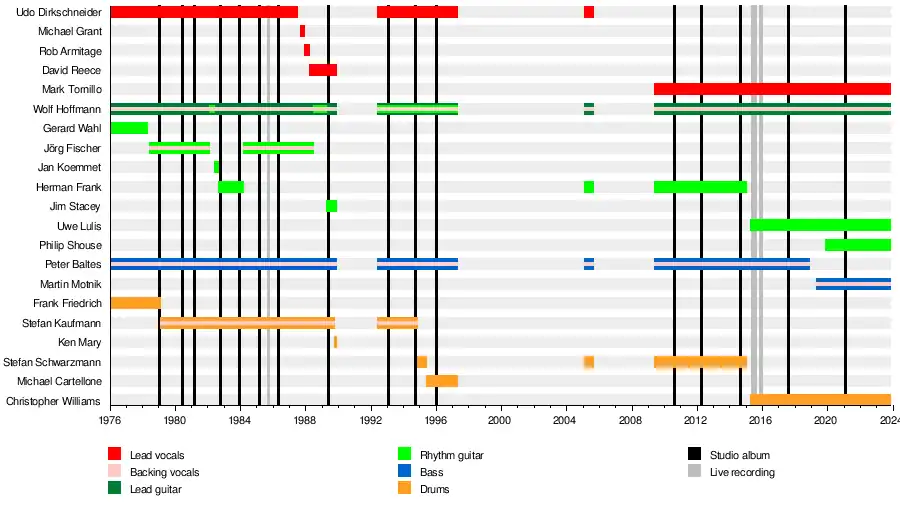 | Mark Tornillo | 2009–present | lead vocals | all Accept releases from Blood of the Nations (2010) onwards | |