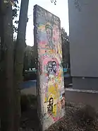 - Berlin – a section of four segments is on display with the external exhibits of the Allied Museum along with a border guard tower and the Checkpoint Charlie guard house. On 13 February 2008, a segment of the Berlin Wall was installed in the courtyard of the U.S. Embassy Berlin on 13 February 2008, "to serve as a reminder of the past and a symbol of hope for the future".[34] A growing collection of painted sections of the wall are on permanent display in Stralauer Allee 3. On Friedrichstrasse, a segment of the wall can be seen next to the Mauermuseum, 40m south of Checkpoint Charlie. On the 20th anniversary of the fall of the Wall in November 2009, two wall segments were set up in front the John F. Kennedy high school building. The two segments were cemented back-to-back, whereby the respective short foot extensions of the bases were cut off. The "West" side is painted with colorful graffiti whereas the "East" side is colored historical plain white.[35]