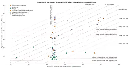 | 30 | January 28, 1846 (aged 44) | Phebe (alt. Phoebe) Ann Morton (1786–1854), aged 59 at marriage | Previously married to James W. Angell (estranged) | Sealed for time and eternity | None with Young, 11 with Angell | Mother of both Mary Ann Angell (m. 1834) and Jemima Angell (m. 1846). Young's mother-in-law at the time of their marriage.[63] Sealed to Angell for eternity and to Young for time.[57] | |