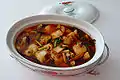 | Fujian red wine chicken | ![]() | 福建紅酒雞 | 福建红酒鸡 | hóngzāojī | a traditional dish of northern Fujian cuisine which is made from braising chicken in red yeast rice. |