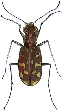 Cicindela is a large genus of tiger beetles, found worldwide. Cicindela includes more than 370 described species in 23 subgenera.[1][2][3]