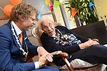 Ebeltje Boekema-Hut (the former oldest living Dutch person), on her 110th birthday (with Ard van der Tuuk, mayor of Westerkwartier).