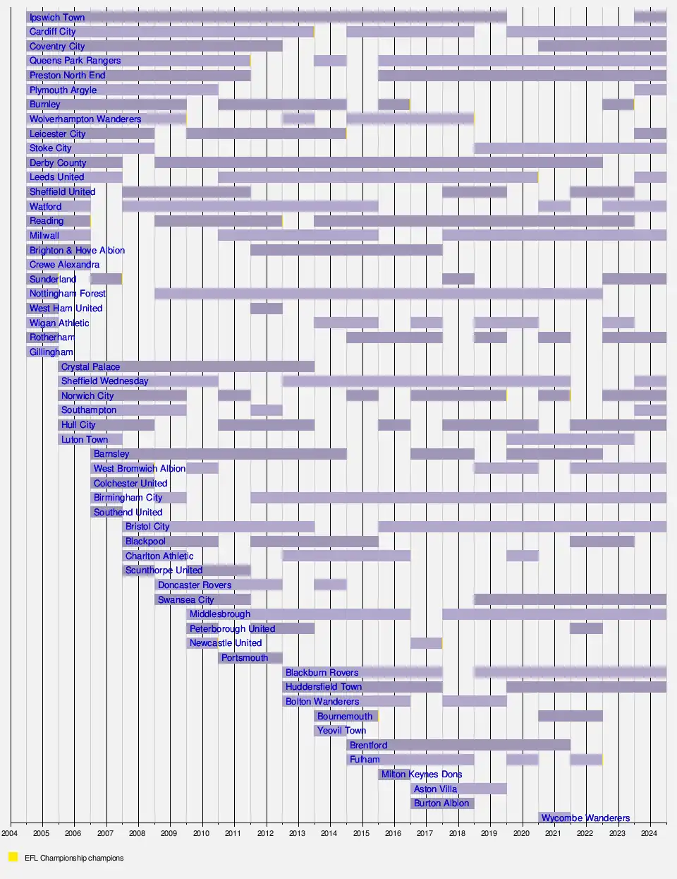 EFL Championship teams confirmed to be playing in the 2023–24 EFL Championship season are indicated in bold. If the longest spell is the current spell, this is indicated in bold, and if the highest finish is that of the most recent season, this is also in bold. A total of 56 teams have played in the Championship.