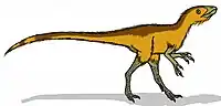 | Concavenator | 2010 | La Huérguina Formation (Early Cretaceous, Barremian) | Preserves bumps on its ulna which have been interpreted as quill knobs,[19] although they might have been muscle attachments instead[20] | ![]() | |