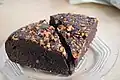 Brownies or sponge cake topped with chocolate icing and sprinkles |
