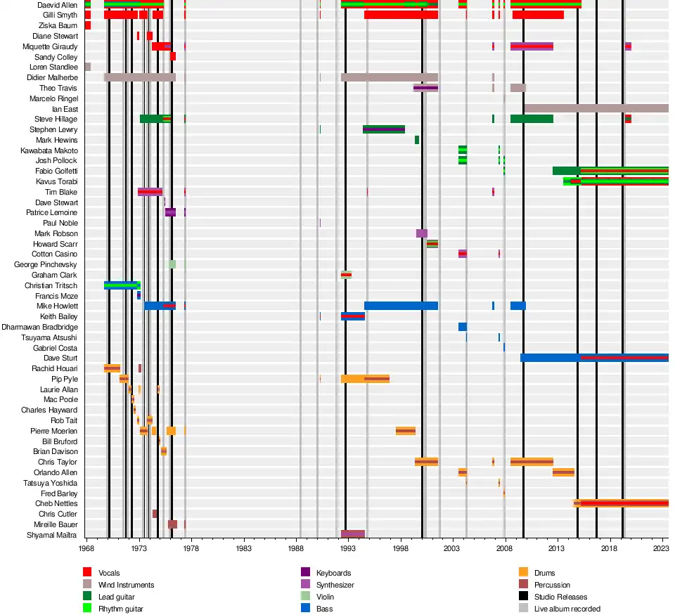Gong are a Franco/British rock band founded by Australian vocalist/guitarist Daevid Allen and English vocalist Gilli Smyth in 1967.[1] The bands first recording line-up featured Allen and Smyth alongside bassist Christian Tritsch, drummer Rachid Houari and saxophonist/flautist Didier Malherbe.[2] The band's current line-up from Allen's death on 13 March 2015 features lead guitarist Fabio Golfetti (in 2007 and since 2012), bassist Dave Sturt (since 2009) saxophonist/flautist Ian East (since 2010), vocalist/guitarist Kavus Torabi (since 2014) and drummer Cheb Nettles (since 2014).[3]