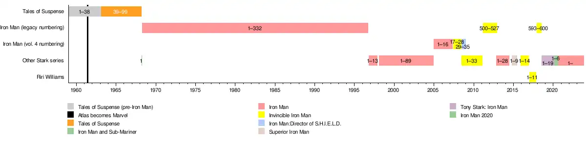 Iron Man is a comic book superhero in the Marvel Comics Universe. Since 1963, he has starred in several ongoing series, as well as a large number of limited series and specials. All stories are published exclusively by Marvel Comics under their standard imprint, unless otherwise noted.