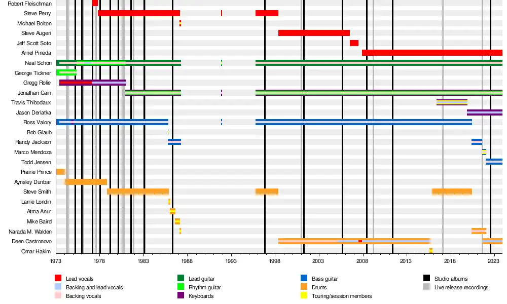 On March 1, 2022, Cain confirmed that neither Walden nor Jackson remained in the lineup, with Walden's exit following a minor heart attack following a live show in Pennsylvania. Nevertheless, both were still featured on Freedom, as they had completed their parts on the album before their departures.[43][44] Schon later stated that Walden and Jackson were still "musical members" of the band, and he would certainly write again with Walden in the future.[45] Schon also did not rule out the possibility of former members Steve Perry and Gregg Rolie returning for a reunion on the band's 50th anniversary.[46] Although Schon had confirmed that former member Rolie would appear with the band for their tour in January 2023,[47][48] He later backtracked that same month, stating that Rolie would not be joining for the 50th anniversary tour,[49][50] although Rolie would later make a guest appearance for the band's performance in Austin on February 22, 2023.[51]