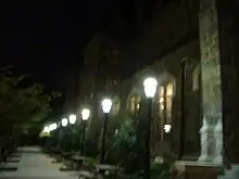 The Alumni Memorial Building is a Gothic building near the center of campus, housing the Visitor Center, the Office of Admissions, the Alumni Association, and the Office of the President. The building is a memorial to the 1,921 Lehigh alumni who served in World War I and the 46 who died. Plaques commemorating those who served in subsequent wars are situated in the lobby. The graceful building was meticulously conceived and designed by Lehigh alumni Theodore G. Visscher and James Lindsey Burley as an "architecturally unique memorial", as Yates notes.[2] It took five years to complete. The building's signature ivy was quietly removed in 2020 while the campus was shut down for the COVID-19 pandemic, the school never commented on why it was removed.