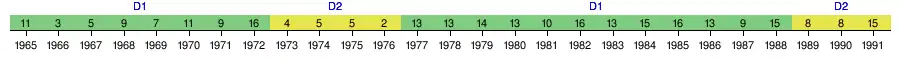 | 1995–96 | 1 | 20 | 11 | 6 | 3 | 42 | 17 | 39 | W | WC | Qual. | |||