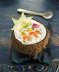Dessert made of rice pudding mixed with whipped cream, sugar, vanilla, and chopped almonds. |