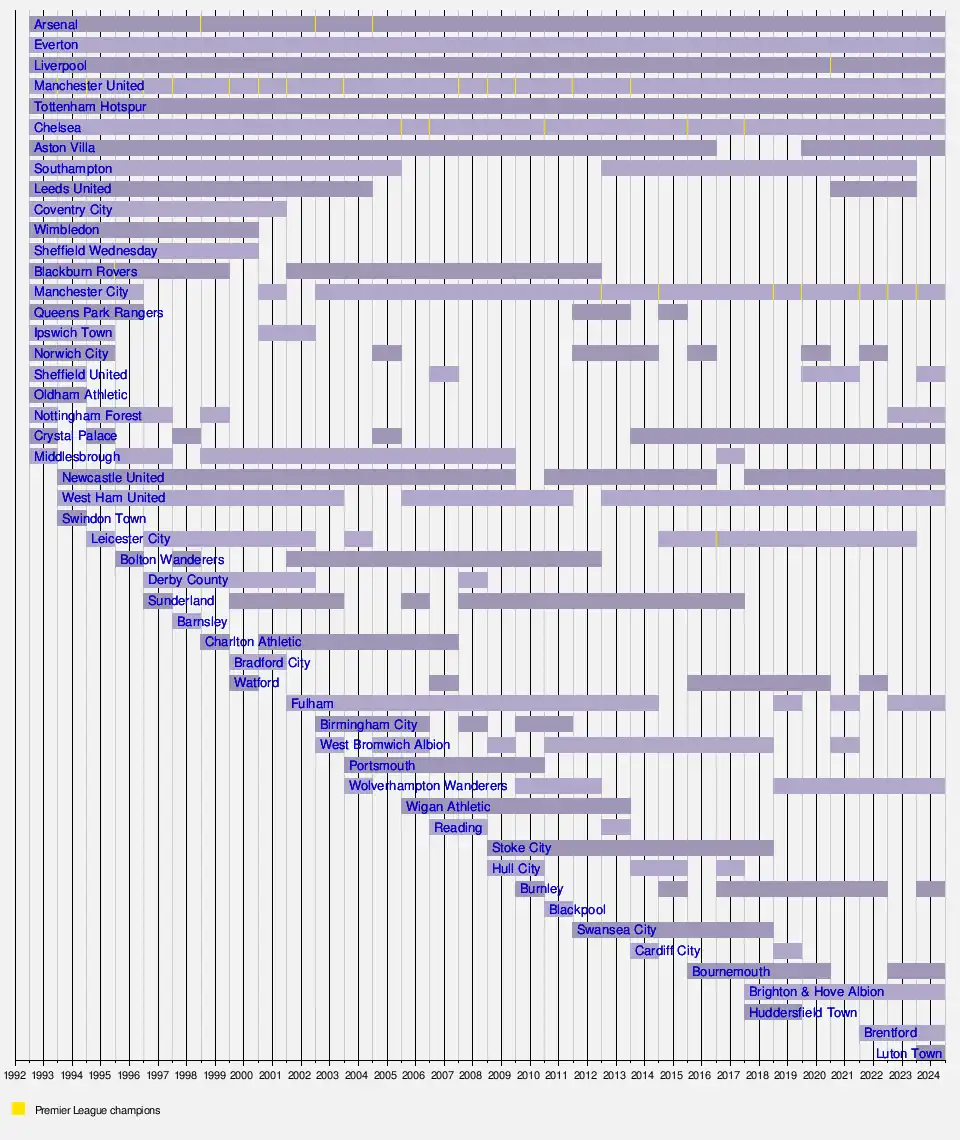 ![]() West Midlands (5) Location of Premier League clubs since 1992 Current members (2023–24) in bold |