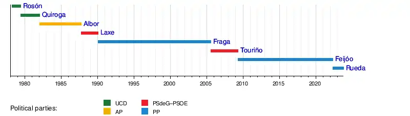 Technically speaking, the first two presidents up to 1981 were presidents of a non-autonomous Galicia, since the actual Statute of Autonomy was only passed in April 1981. Nonetheless, they played an important role in setting up the institution.