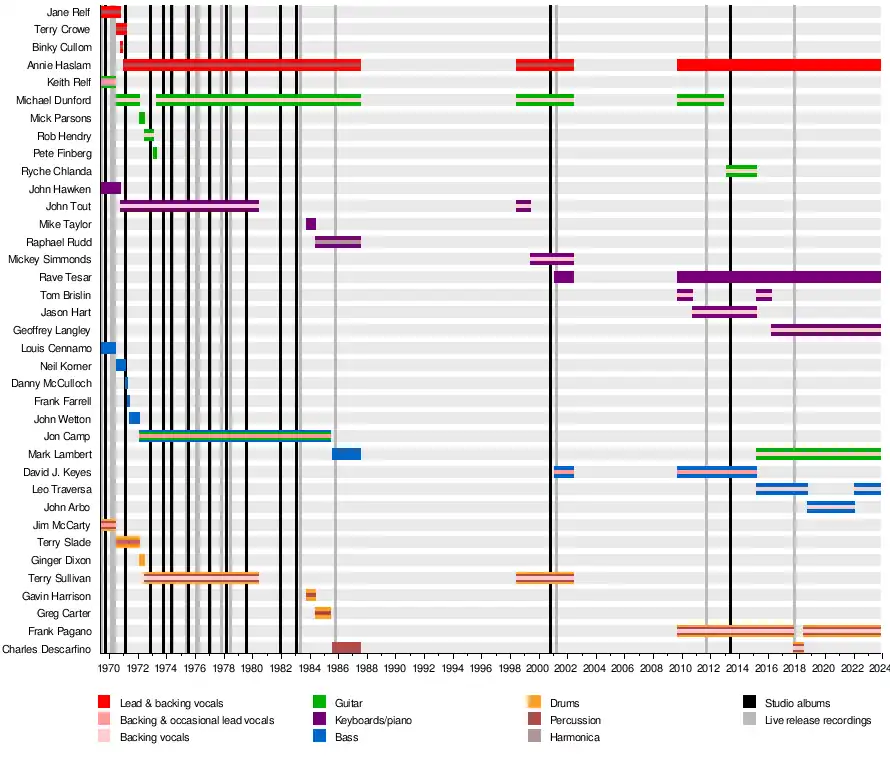 By October 2010, Brislin had been replaced by Jason Hart.[25] On 20 November 2012, Dunford died after suffering a cerebral hemorrhage.[26] Despite the loss of a central member, Haslam assured that Renaissance would continue, and the following February it was announced that Ryche Chlanda would take over as the band's guitarist.[27] Grandine il vento, a new studio album recorded prior to Dunford's death, was released a few months later.[28] In 2015, Chlanda, Keyes and Hart were replaced by Mark Lambert, Leo Traversa and Tom Brislin, respectively.[29] The following year, Brislin was replaced again by Geoffrey Langley.[30] Charles Descarfino replaced Pagano in 2017 for an orchestral tour,[31] although by 2018 the drummer had returned to the band.[32] Later in the year, John Arbo replaced Traversa on bass.[23]