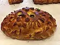 A large round braided bread, traditionally baked from wheat flour and decorated with symbolic flags and figurines, such as suns, moons, birds, animals, and pine cones. |