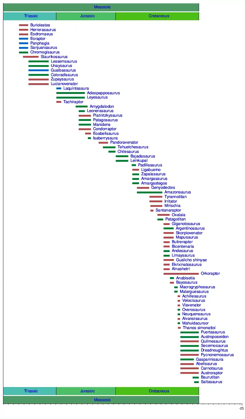 This is a timeline of selected dinosaurs from the list above. Time is measured in Ma, megaannum, along the x-axis. Carnivores are shown in red, herbivores in green and omnivores in blue.