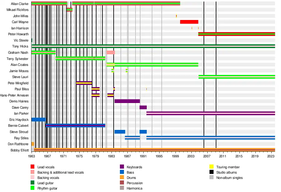 In early 1966, Haydock refused to attend recording sessions due to a dispute with the band's management over earnings.[5] He was replaced in July by Bernie Calvert,[6] another former bandmate of Hicks and Elliott, who had earlier filled in for Haydock on a European tour and the recording of "Bus Stop".[7] After a string of successful releases, Nash left The Hollies on 7 December 1968 to relocate to Los Angeles, California, and form Crosby, Stills & Nash with former Byrds member David Crosby and former Buffalo Springfield member Stephen Stills.[8] Terry Sylvester left the Swinging Blue Jeans to take Nash's place the following month.[9] Clarke remained until November 1971, when he was replaced by Swedish singer Mikael Rickfors after leaving to pursue a solo career.[10] Clarke returned in June 1973 as lead vocalist.[11]