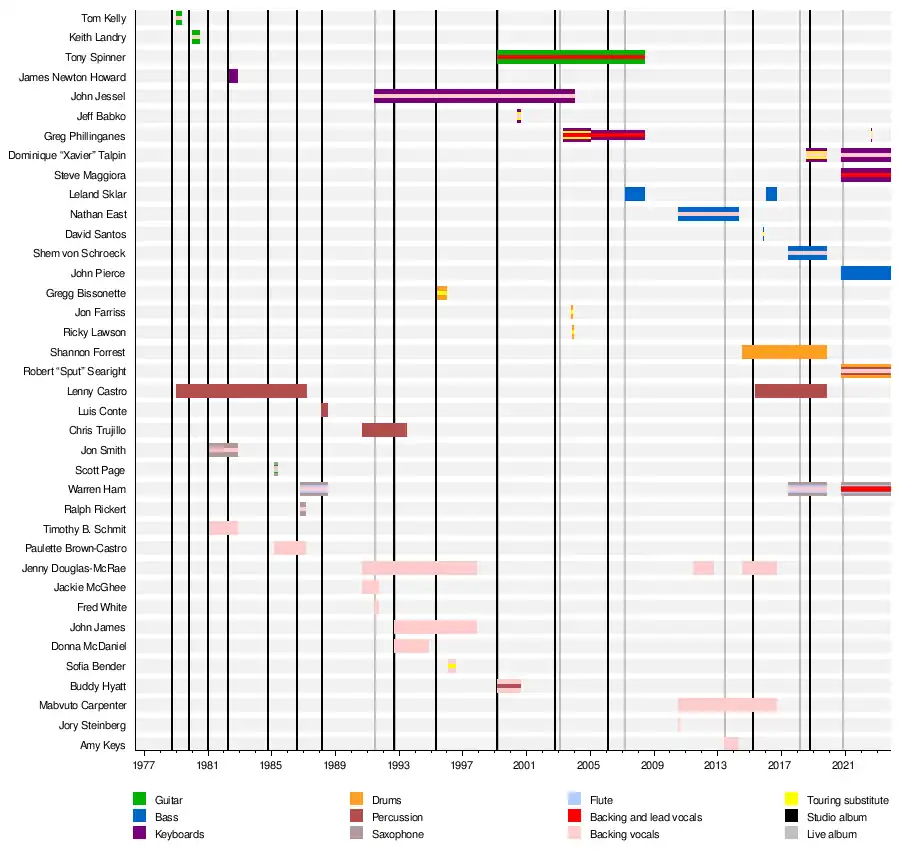 | Greg Phillinganes | 2005–2008 (touring substitute for Paich from 2003–05 until his semi-retirement from the group in 2005; temporary substitute for Dominique "Xavier" Taplin in 2022)[10][12] |