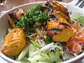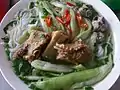 Huế | Noodle dish | Grilled pork (often shredded) and cold vermicelli noodles over a bed of greens (salad and sliced cucumber), herbs and bean sprouts. Also often includes a few chopped up egg rolls, spring onions, and shrimp. Served with roasted peanuts on top and a small bowl of nước chấm.[1][3][6] |
