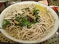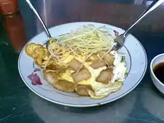 Noodle dish | Deep-fried egg noodles, topped with seafood, vegetables, and a sauce | |