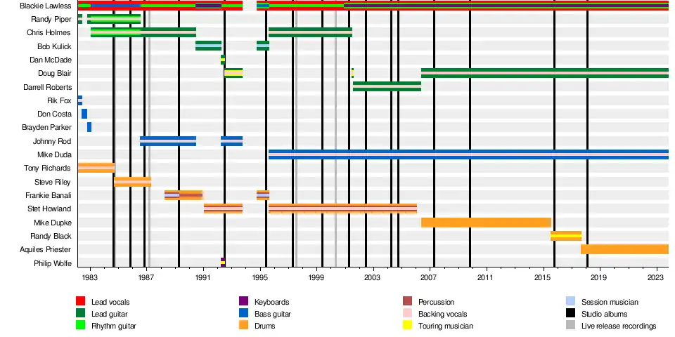 Lawless is the last remaining original member of the group, which currently also features lead guitarist Doug Blair (in 1992 and 2001, and since 2006), bassist Mike Duda (since 1995) and drummer Aquiles Priester (since 2017).