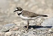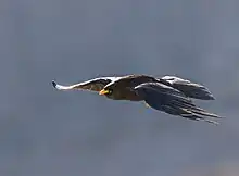 Bustards are large terrestrial birds mainly associated with dry open country and steppes in the Old World. They are omnivorous and nest on the ground. They walk steadily on strong legs and big toes, pecking for food as they go. They have long broad wings with "fingered" wingtips and striking patterns in flight. Many have interesting mating displays.