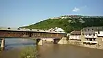 - The initial covered bridge of Lovech, built between 1874 and 1876 had a length of 84 m (276 ft), 6 vents and accommodated 64 shops. It was, however, wholly destroyed by fire in 1925.[8] A more modern bridge was constructed at its place in 1931 only to be replaced by a reconstruction of Kolyu Ficheto's design in 1981–82. The current bridge is 106 m (348 ft) long and has 14 shops, the architect being Zlatev.[9]