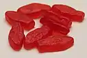 This gummy has a strawberry pink top and white base, it is covered with crystallized sugar to give it more flavor. Its flavor usually is strawberry cream, although it also has a chocolate covered variant.[18] |