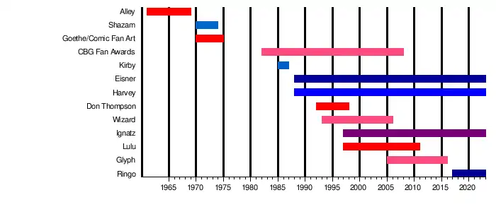 The following is a timeline of notable U.S. comics awards that feature multiple categories. Awards voted on by professionals are in shades of blue; fan awards are in shades of red. (The Ignatz Award is a mixture, as the nominees are selected by professionals, but the winners are determined by the attendees of that year's Small Press Expo.)