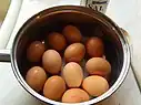 Plain | This dish is boiled either long enough for the yolk to become solid ("hard boiled") or just long enough for the egg white to solidify ("soft boiled"). A similar result may be achieved by steaming the eggs rather than boiling.[11] | |