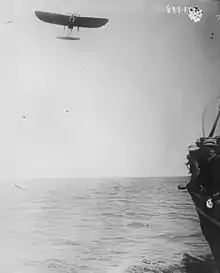 - First shipboard take-off and landing by an airplane: was made by Eugene Burton Ely, in a Curtiss Model D pusher, from a temporary platform aboard light cruiser USS Birmingham on November 14, 1910.[68] Ely was also the first to land an airplane on a ship, touching down on a temporary platform aboard armored cruiser USS Pennsylvania on January 11, 1911.[69]