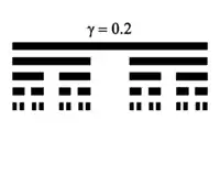 | Solution of | 1.6402 | Attractor of IFS with 3 similarities of ratios 1/3, 1/2 and 2/3 | ![]() | Generalization : Providing the open set condition holds, the attractor of an iterated function system consisting of similarities of ratios , has Hausdorff dimension , solution of the equation coinciding with the iteration function of the Euclidean contraction factor: .[5] |