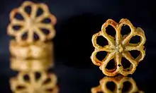India | A South Indian snack of savory crunchy twists made from rice and urad dal flour.[2] Murukku means twisted in the Tamil language.[3] The town of Manapparai in Tamil Nadu is particularly known for its murukku.[4] Murukku is made in many varieties as a traditional treat for festivals such as Diwali and Krishna Janmashtami.[5] Murukku are often served on special occasions within Iyer (Tamil Brahmin) families.[6] |