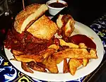 | Chili burger | ![]() | Thomas M. "Ptomaine Tommy" DeForest appears to have developed the chili burger in the 1920s[17] | Consists of a hamburger, with the patty topped with chili con carne[18][19][20] |