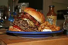 This is a list of notable hamburgers. A hamburger consists of a cooked patty of ground meat usually placed between two slices of a bread roll. Hamburgers are often served with lettuce, bacon, tomato, onion, pickles, cheese, and condiments such as mustard, mayonnaise, ketchup, and relish.[1] There are many types of regional hamburgers with significant variations.