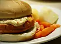 | Salmon burger | ![]() | United States | Fishcake made mostly from salmon in the style of a hamburger. Salmon burgers are especially common in Alaska where they are routinely offered as an alternative to beef hamburgers.[37] |