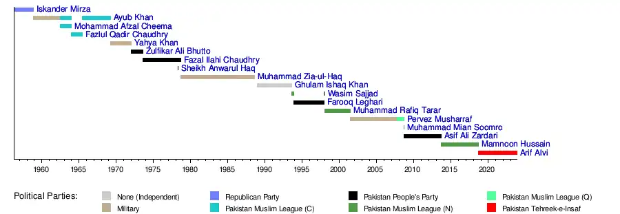 There have been a total of 13 presidents. The first president was Iskander Ali Mirza who entered office on 23 March 1956. The current office holder is Arif Alvi, who took charge on 9 September 2018, following his victory in the 2018 elections.[1]