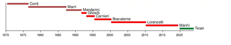 The most durable junta was the first Marini junta, with 5 years, 2 months and 1 day, while the shorter one was the first Ghirelli junta.