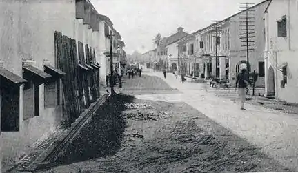 Plots of land had been sold to the Chinese by the local land-owning aristocrat, the Dato Panglima Kinta, Mohamed Jusuf, who had laid them out with broad, straight streets but the rapid development had been disorderly so that the main road to Gopeng varied in width from 20 to 70 feet. There was then a great fire on 1 June 1892, which destroyed much of the town's wooden buildings which had attap palm thatch roofs. The reconstruction of the town was organised by the British Collector of Land Revenue, W.J.P. Hume, who straightened the road network, redrew the land boundaries and issued new title deeds. He had no formal authority to do so but his influence and good sense made a success of the scheme. The streets were now 50–60 feet wide, brick drains were laid and shade trees planted.[2]