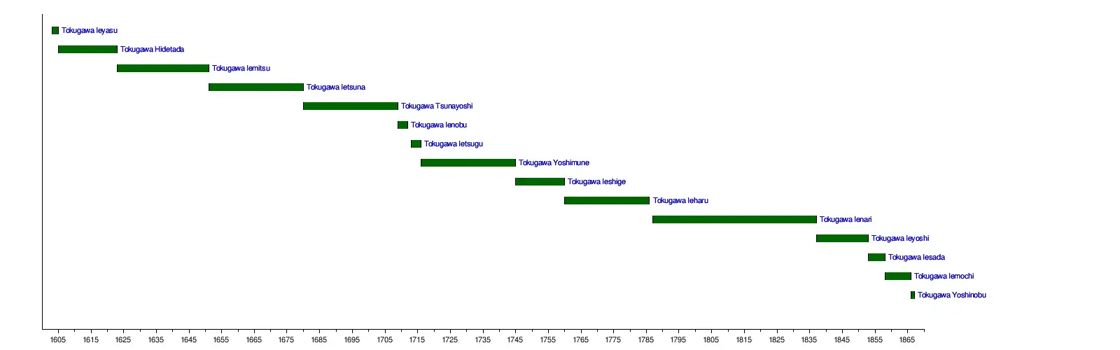 Shoguns that ruled Japan intermittently, as hereditary military dictators,[1] from the beginning of the Asuka period in 709 until the end of the Tokugawa shogunate in 1868.[lower-alpha 1] are as follows: