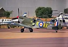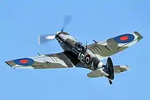 - Spitfire Tr.9 MJ772 (G-AVAV). Served with 341 Squadron, Royal Air Force as NL-W then with 340 Squadron as GW-A. Sold to Vickers-Armstrongs in 1950, converted to two-seat trainer. Carried Class B markings G-15-172. To Irish Air Corps in May 1951 as IAC 159. Withdrawn from flying in 1960. Sold to Film Aviation Services in November 1963 and stored at Biggin Hill. Sold to COGEA, Belgium in May 1964 and stored at Ostend Airport. Sold to Tony Samuelson in 1965 and registered G-AVAV in November 1966. Restored to airworthy condition in July 1967. Leased to Spitfire Productions Ltd for use in the film Battle of Britain. A forced landing was made at Little Staughton on 9 July 1968 due to engine failure, and subsequently returned to flying condition. Later sold to Sir William Roberts and displayed as part of the Strathallan Collection, coded NL-R. Sold to Doug Champlin of Enid, Arizona, registered N8R. Later registered in Germany as D-FMKN.[86] Suffered off-airport landing in field, near Woodchurch, Kent, United Kingdom, on 7 September 2015. Pilot uninjured.[87][88] As of March 2019, airworthy owned by Warbird Experiences Ltd, based at Biggin Hill airfield.[89] In August 2021, MJ772 was flown to its new home in The Netherlands with the Flying Vintage Everyday Foundation.[90]