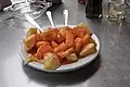 Also known as papas bravas: fried potato dice (sometimes parboiled and then fried, or simply boiled) served with one or several spicy sauces (e.g. tomato sauce, mayo, aioli) |