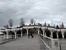 Arup Group oversaw the structural design of the park.[7][8] Little Island is supported by 132 pot-shaped structures suspended above the water.[7][9] These "tulip pots" vary in height and are between 15 and 62 ft (4.6 and 18.9 m) above the mean waterline.[7] This was meant to protect the park from a 500-year flood, in which the water level in the river rises as much as 11 ft (3.4 m).[10] The heights of the pots was intended to give the appearance of a floating leaf[2] or a wave.[10] Numerous other firms were involved in the structural design, including precast cement contractor Fort Miller Company, marine consultant Mueser Rutledge Consulting Engineers, and marine contractor Weeks Marine.[10]