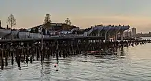 By October 2019, much of the park's perimeter had been installed.[58] That month, the project was renamed Little Island.[5][59][60] The first trees at Little Island were installed in March 2020.[15][61][62] According to photos taken the next month, all the piles and pots had been installed, and the layers of soil supporting the vegetation were being planted.[61] Despite the onset of the COVID-19 pandemic in New York City during 2020, the park's construction was allowed to proceed even as most other projects were forced to stop. Work was temporarily halted for three weeks to disinfect the worksite, but the park was otherwise classified as an "essential project". Since most of the work was conducted outdoors, Little Island's construction site was considered a less likely place for COVID-19 to spread compared to indoor projects.[10] The park's construction was nearly completed by early 2021.[63]