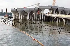 Cuomo provided $50 million for the park in April 2018, but with the condition that the city raise a matching amount.[53] Construction of the structure began the same month, with the construction of walkways from the Hudson River Park esplanade to the future park site.[54][55] The new estimate for the project was $250 million.[56] By that August, the pilings were being installed.[57] A symbolic cornerstone was laid in December 2018.[9] At this time, the first of the park's pots was delivered from upstate New York and installed at Pier 55. The park itself was planned to be significantly completed in 2020 and open to the public in early 2021.[9][11] The pots were manufactured and delivered by the Fort Miller Company starting in 2018. The pilings upon which the pots were to be installed, could only be driven from May to November of each year. As a result, 164 piles were driven in 2018 and the remaining 103 piles were driven from May to July 2019. The subsequent construction of the landscape, concession, and programming areas required coordination between the different contractors due to limited space for staging areas. Several cranes were used, including one on a barge, and materials were delivered by barge.[10]