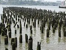 After the petals were manufactured, they were driven to the Port of Coeymans, a port on the Hudson River south of Albany, New York. At the Port of Coeymans, Weeks Marine assembled the individual petals and used a crane to load them onto barges. The barges typically traveled from the Port of Coeymans to Manhattan in 14 hours.[10] Once in Manhattan, the pots were installed on their supports using a 350-ton crane. The largest support is 30 ft (9.1 m) tall and weighs 90 short tons (80 long tons; 82 t).[9][11] The pots stand on 267[10] or 280 concrete pilings, which extend at most 200 ft (61 m) into the bottom of the Hudson River.[7][8] Each piling measures 3 ft (0.91 m) in diameter and can handle loads of 250 to 350 short tons (220 to 310 long tons; 230 to 320 t). The pilings were hollowed at their cores, with metal guide rails to allow the pots to be installed without the pilings tipping over. The edges of the pots are placed 9 ± 3 in (229 ± 76 mm) apart.[10]
