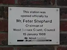 A station building similar to that at Arundel was provided; this lasted until 1937, after which redevelopment was severely delayed by the Second World War and planning disputes.[4] One original structure remained until 1986, when Network SouthEast started building a new concourse and ticket office. This was finished late in 1987, and was officially unveiled on 15 January 1988.[5][6][7] The line was electrified in 1938, with an official unveiling ceremony being held on 30 June 1938.[8] The station handled goods traffic until 1970.[9]