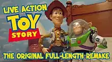 Live Action Toy Story is a 2012 comedy-adventure fan film produced by the Arizona-based Jonason Pauley and Jesse Perrotta; it is a shot-by-shot recreation of the 1995 original computer-animated film of the same name, with the toy characters animated through stop-motion or filmed moving with wires and strings.[1] As of 30 August 2023, it has nearly 49.9 million views on YouTube.